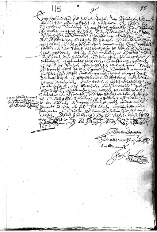 oorsaecken te mogen. compromitteren, d'uyt sproocken ten avoywen oft reductie te versoecken, Compareerde de heere Johan van Benthem Gecomt. Raedt ter admiraliteyt in Zeelandt, En heeft E: geconstitueert in machtich genaect Constitueerde ende maect machtich bij desen De Heere Mr. Johan van Velt huijsen, Advocaet s'hoofts van utrecht, ende Sr Aelbert van Benthem sijn swager ende broeder respe. te samen ende elcx besonder, omme zijn Constituants saecken, ende affairen alhier waer te nemen ende verrichten zijne goederen, actien, ende krediten, ie administreren te verhuren, verhandelen, ende vercopen, penningen te ontfangen, ajuitantien te geven, Transporten, te doen, bij afflossingen de plechten te laten casseren ende voorts alles te doen t' gene hy Compten alomme present sijnde selffs soude connen, ofte mogen doen de onwillige ende gebreeckende debiteuren met justitie te constringeren, daer toe in en buijten rechten te ageren soo int eysen ende, als verweren, leven te contesteren alle dagen, ende te mijnen van rechten te observeeren, Sententie te versoecken, ende te de selve ter executie te stellen off daer van te appelleren off revoderen de accorderen, ende composeren, ende een ofte meer 1 Procurs ad lites, ie substitueren. Belovende de rat. Onder verbant ende submissie als naer rechten. Aldus gedaen, ende gepasseert binnen utrecht erpet van duijvenhoff ende ter presentie van Een Tijmonsz als getuygen opden vijen Augusti 1656. Jan van Benthem Geraert van Duijvenhof Jan Simonsz Jan van Leepen 1656: