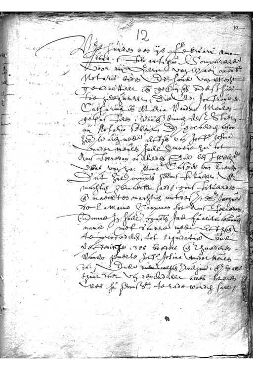 Op huijden den ijen Februarij anno 1644 stilo an te quo Compareerde voor mij Gerrit van Waeij openb:r Notaris bij den Ed: soude van Mecht geadmitteert ende getuijgen ouders hier toe gerequireert, Die Ed: Joffrouw en Catharina ende Maria Vander Meulen gejusteren. Wou ende binnen deser Staet my Notario bekent. En verclaerden alsoo zal waren mede Erffges van Joffe Josina vander meulen saeil vermoeije zal tot Amstelredam overleden, die lest weduwe was van za: Monsr Casper van Tienen. Dat zijl. compten. geconstitueert. machtich gemaeckt hadden, constitueerden ende maeck ten machtich mit desen, Sr. Jacques de la maine Coopmas tot Amstelredam Omme In haerl. compten. Inde quaalite tesboven name, met s'andere mede Erffgen. te procederen, tot liquidatie ende reffeninge des boedels ende goederen Van de hemelte Joffe Josina vander Meulen sa: Ende dien volgende daerinne, ende in alle tgunt daer van dependeert alles te doen wes hu gewuste te rade worden sall,