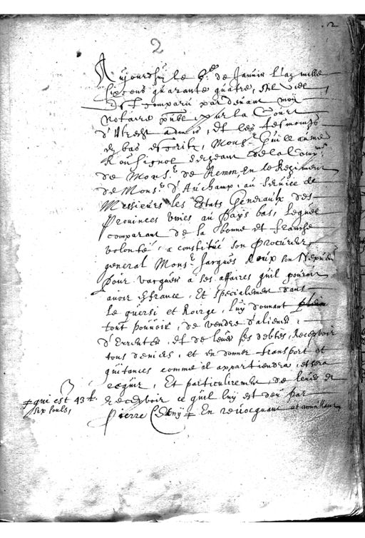 #qui est 43 £. six puls, Aujourdsuij le S:e de Januir l’an mille sixcens quarante quatre, stil viel est comparu par devant moij notaire publ par la Court d’ Vtrecht admis, et les tes moings en bas escritz, Monsr Guillau me Rousignol sergeant de la Comp. de Mons. de Remon, En le Regiment de Monsr d’ Auchamp, au service de Messieurs les Estats Generaulx des Provinces Unies au Pays Bas, lequel comparant de sa bonne et franche volonte, a constitué son procureur, general Monsr Jacques Roux son Nepuen pour vacquer a ses affaires quil pouroit avoir en france, Et specialement dans le guersi et roirge, luij donnant plein tout pouvoir, de vendre d'aliener. d’Errenter, et de lever ses debtes, recepvoir tous deniers, et en donner transport et quitances comme il appartiendra, et sera requir, Et particulierement, de lever et recepvoir ce quil luy est deu par Pterre Chang = En revocquant et annoillans
