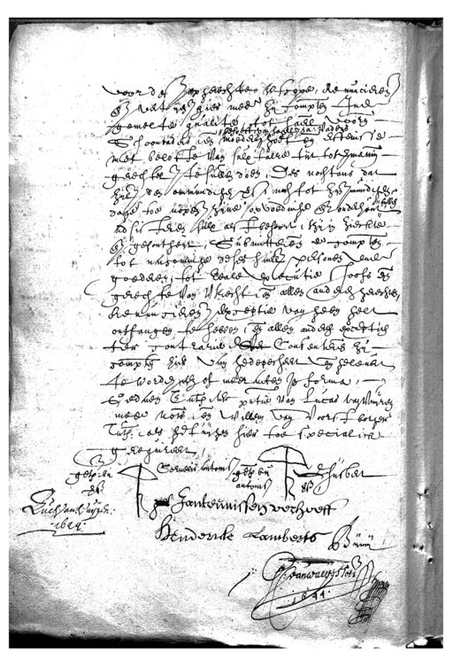 voor desen opgerechte utcope, renuncierende ende vertyen hier mede zy compten Inde gemelte qualite tot haerl. voorn. Schoonvaders ende moeders goet ende effenisse met belofte van sulx jaire tijt tot vermanin gerechtel te sullen doen. Des nochtans dat zyl den ommundigen voors. noch tot zynen inundigen dage toe nopende zyne opvoedinge ende onderhouten sullen adsisteren sulx alst behoort, tzy in zieckte ende gesontheyt, Submitterende de compten. tot nagominge deses huillen personen ende goederen, tot reale executie stoofs ende gerechte van Vtrecht, ende allen anderen gerechten kevangierende exceptie van heen gelt ontfangen te hebben, ende allen anderen exceptien ter Jontrarie der Consenterende zy compten hier van gedepecheert vande gelevert te worden een of meer acten in forma. Gedaen Enthier pntie. van Lucas van Vuyren mede nots. ende Willem van Voorst borger Tuts: als getuijgen hier toe specialick gerequireert. behoeft van haellna: vaders G. gaet. get. by Cornelis antonisz get. bij Ghusbert voors. Vuijren. al Janteunissen verhoeff Henderick Lamberts Bijmij antoins G: van waer Nots. 1644.