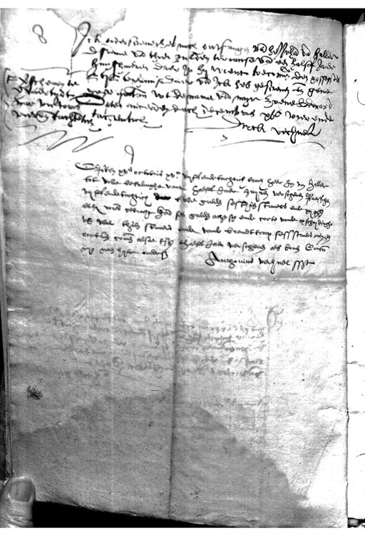 verschepen te waertydt nae vieltoris vier ende tachten schenen te gese quitancie uut de name vande myr zoene Gerap de jaertydt Orten anderden dach decembris xvc vier ende die victoris heeren tachtetich Ick onderscreven heb noch ontfangen van hem Johan van Hallere de somme van thien gulden ter cause van een halff Jaer Stijt vermis daer va ick heb gescreven ende geve mysluieren daer hy hy wient toecomen den possessie tachentich Dirck vechvel Gisten xven octobris xvc vyffendetachtich broch heer in van haller tot volle betalinghe vant hoeff Jaer huyren verschenen Paesschen vyffendetochtich daer twe gulden sesthien stuvers ende xij pen ty vorens gedracht had ses gulden acht stver ende corte vande opschrydinghe wil thien stuvers ende vande brandttrap sess stuivers ontzien van comen alsoe tsy thaeff Jaer verschenen als boven Confan naen hyer ondersz Anthonius verhuel sinte