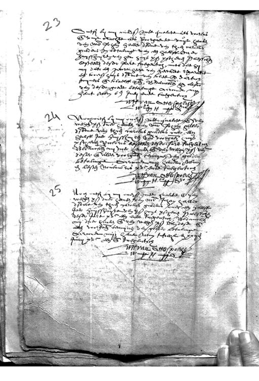 Ontf by my ouders inde qualite als voorens ende uuyt crachte als voorgaende vuyt handen van mr Johan haller d somme van thien carolus guldens in betalinge van een hallff daer huysshuyre van het huys voors. verschenen Paessche lestleden deser Jare tnegentich mits dat hy my daer aen gecort heeft van heeckere reparatie aen tvoers huys d somme van twee ende dartich stuyvers ende twaelff penningen, Bedancken hen alsoo van deser goede betalinge Garcondt myn hant Actum v en July ende tnegentich Noch onts by my onders inde qualite ende van weegen yss duer handen van mr Johan haller de somme van thien carolus guldens ruer een halff jaer huysshuyren vande voorgaende huys verschenen victoris lestleden deser Jare tnegentich Bedancken my duer handen ende van weegen voors. van deser ende allen voorgaende termynen van goederen betalinge Oercondt myn handt Actum en lesten novembris xvc ende tnegentich Noch ontf by my one weegen voors. duer handen d somme van thien carolus ge jaer huys Zw Hoo Acht van Otterspoers 4/4 # Julij „ voersz. Noch ontfangen by my overseyde inde qualite ende van weegen x stuvers duer handen van mr Johan hallere d somme van thien carolus guldens over een hallff jaer huysshuyse van yss huys verschenen Paesschen deser Jare xvc een ende Inegentich Bedancken om daer handen ende van weegen voors. van deser ende allen voorgaende temijnen van geesder betalinge Cerconde mijn hant Actum Intrecht ende Juny xvc een ende tnegentich uitt van Otto spoech #