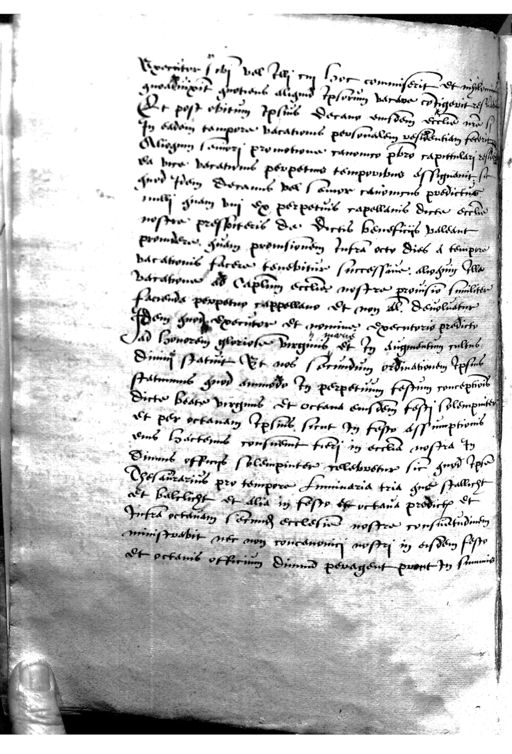 ad honorem gloriose virginis et in augmentum cultus Executer sibi vel illi cum hoc commiserit et nihilomni queaduixit quotiens aliquis ipsorum vacare cotigerit resu Et post obitum ipsius decano eiusdem ecclesie nre in eadem tempore vacationis personalem residentiam feceris Aliogum / emori pronictione canonico pbro capittulari resi de vice vacatimus perpetuus temporibus assignavit, sal quod idem Decanus vel semor canonicus predictus milli quam viij ex perpetuis capellanis dicte ecclesie nostie presbiteris de dictis beneficijs valeant promdere quam provisionem infra octo dies a tempore vacationis facere tenebitur successave alio hun ille vacatione ab Caplum ecclesie nostre provisio similiter faciende perpetue cappellano et non al devolvatur Idem quod executor et nomine executoris predicto diminii statuit Et nos secundum ordinationem ipsius statuimus quod ammodo in perpetuum festum conceptiois dicte beate virguus et octava eiusdem festi solempniter et per octanam ipsius sicut in festo assumptionis eius hactenus consnemt fieri in ecclia nostra in dimus officiis solempinter celebretur sic quod ipse Thesaurarius pro tempore Liminaria tria que stallicht et balclicht et alia in festo et octava predict. et jufre octavam secunde ecclesie nostre consuetudinem ministrabit nec non concenonici nostri in eisdem festi et octanis officium dimum peragent prout in summa marie