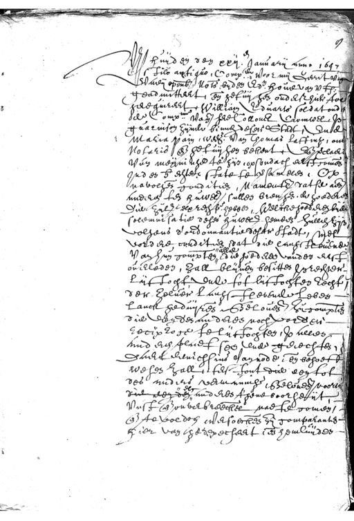 Op huijden den xxijen. January anno 1647 stilo antiquo, Compagnie. Voor mij Gerrit van Waeij openb. Nots. by den Ed:n hove van U.Ed: geadmitteert, ende getuijgen ondersz hier toe gerequireert, William Eduarts soldat oudt de Comp:e van de here Collonel Cromwel, In guarnison zijnde binnen deser Stadt, Ende Maria Pain, wede. van Thomas laffing, ons Notaris ende getuijgen bekent. Ende verclaert van meijninge te zijn, op sondach eerstcomende Inden h. echter state te versamelen. Op navolges fonditien, namentl. datse aende anderen ten huwel sullen brengen. De goederen Die zulx elx rechte hebben, welcke goederen bijde solemnisatie deses huwel. hemden zullen zijn volgens d'ordonnantie deser stadt, met vordere conditien, dat die langstlevende Van hun compten alle die goederen vanden eerst overleden, zall blijven besitten in rechter. lyftocht ende tot lijftochten recht der zelver langstlevende Leven lanck geduijren Belovende zij compten. die den den anderen noch vorder reciproje te lijftochten, In alles kinderen plaetsen ende gerechten daert eenichsins van rode, ende behoeff wesen zall, testont die een tot des anders vermaninge, Belovende voorts die een „ den „ anderen t' gene voorheijt Vust ende onverbreeckel nae te comen, ende te voldoen oversoeckende zij comparanten hier van tge depecheert ende hemluijden