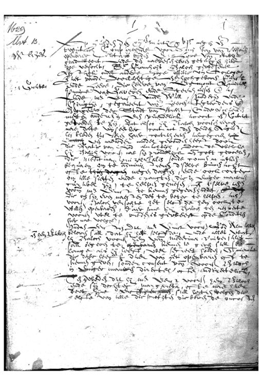 1629 Mrt. B. est leges. aen Grijver ende hem Beloge Op huijden den xiijen martij xvic negen ende twintich Compareerde voor 6 mij Jan van Vechouken openbaer Geletaris byden E: Hove vande Utrecht geadmitteert, ende den naebeschreven getuijgen hier toe versochten Sr Franchoijs Baloch gewesene lestlyck onder andere Hoge offitie van Oorloge Riet vande Doorluchtige ende hoochgeboren Furst ende heere, die heere van Egmont Lamerkel Prince van Gaveren ende Steenhuisen ende als ende mr ernst vande Wall, medecijn ende Chirugtijn, gegoneert vande heeren Regierdens ende Borgemeesters der Stadt van Utrecht, Oude verclaerden metten anderen in een vriendelick accoort ende Contract getreden te zijn, dat alsoo hij Balich voorschreven nae date van seecker contract den derden Augusti lestleden tusschen haer contachenten aengegaen, hij Gelok een naerder middel gevonden heeft door die Gratie van God almachtich, Door de welcke die medicina vin versalis soude connen in aecken bequaem om te administreren d'selve binnen acht Balich voors nae sijn grondelijck ende goet gevoelen ofte thien dagen negen dagen, ende oock corter om alle siecten ende crancten die in eniger manieren curabel zyn) te helpen gevesen, ende t'selve aen de voorn mr Eemst te kennen gegeven hadde, ende die die om sijn even naesten des te beter te helpen, aen voors. Baloch versochte het selffde hem oock te willen openbaren, daer inne hij Baloch ten respecte voorsz wel te vreden is geweest op de Conditien hier naer volgende Indien eersten dat mr Ernst voors God Almschte och beloven sall, dat hij het selffde, ende alles wat hij Baloch voort hem van medecina Vuiver, klis sall begeren ten openbaren kennen te geven stel soo lange als hij leeft, wel secreet houden, ende niemant die daer leeft daer van ijet openbaren off te kennen geven, sonder consent van voorss. Blorch in eniger manieren directel. ofte indirectelick, Ten tweden dat hij mr. Eerst voors hem Baloch ende sijn dochter margareta, ofte nae hier deet zijne erffgenamen sull herten volgen die helfte van alle die profijten die boven de oncosten