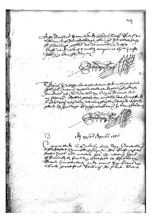 Evert Anthonio van Lienden ende Jan Claessen Raech de Leerdam Gelooffweerdige gebruyge hier toe versocht ende sonderlinge gebede die de minute van deesen fangende aende Leach e metten comparant ende mij ons hebbe In kennisse van mij de waerden Teisaick In deesen bovengementroueerde acte verhaekt hebbe ick notaris mette voerbenoemde getuyge gedaen immediaete aen Mr Cornelis van Cuyck Advocaet die mij seyde ende begeerde gerelateert te hebben dat hij ongesonden is opden voers versueken verclaringe ofte anderwoordt te geven gedaen ten Jare dage ende presentie als voore In kennisse vadmit den xxve Aprilis 1585 Gewaerden Compareerden Guilielen kaem van Cravenburch Scheesene monsterschrijver des Rithmeesters Anthoni Joiek oudt autreur zes ende veertich Jare ende filiaerden by forme van Attestatie ten persueke van Bartckr. Matterborch inden name van frans van Galen geweesene Hendrich der selver staende