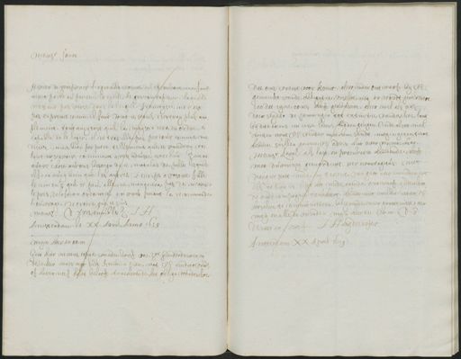 Monsr Janot je vien de recepvoir l'agreade vostre du 18 jouvant, ona faire avant parvé au porteur d'icelle le gavcontapissier, laquelle n'estant pas versé dans la langue francoijse. ne c'est pas expire comme il faut, dont je vous escrivay plus am¬ lement. tout aussytost que la maijson sera en ordre, en rapable de le loger, il ne travelle pas perjour comme ne disiez, mais bien per prece, tellement que je voudroij vo. lontier scavoir, commant avez adiuste avec lui. Entre autre chose aurons besoign de 2 matalas de palle lesquels il fera aucy bien que les autres: s'escrips a vostre fille le mieux que je peu, elle ne manquera pas de m'arrier le pris, de la façon ordonneé en vous priant la recommander l'ouvrage, de croire que je suis mons. V tres humble h. S. H. Amsterdam le XXe Avril Anno 1659 mijn haren oom Gaet hier nevens copije vanden brief van het Guiderdeuren en de backer waer uyt sult kunnen zien, wat V.E. aendito vnnde of haven neef hebt belooft, t'oncherende het obligo voor deselve dat ons vremt voor komt, alsoo inden ontwars bij V.E. gemaeckt vande obligatie, deselve niet en wordt geresessert soo dat sijne oomen heeft geabuseert, alsoo wel als ons doen seyde de penningen tot extinctie van deselve land bij dito ooms in cassa ledich / hadden gelegen. Ende alsoo niet weten wat VE. verder met hem sondt mogen getracteert hebben, sullen gairne ve advis hier over verwachten Monsr. Laal als last, en procuratie hebbende heeft met durerneij geaccordeert, seer avantagieus met vergeer staet mede in terme van goet accommodement als te sien is uijt het mede gaende ontwars, ende alsoo de oude compagnie toucheert hebbe niet willen acten vE hetselve te communiceren. Olijvende naer groetenisse aen moij en alle de vrinden myn heeren Oom. D E dinaer en preef Stuijdecoper Amsterdam XX April 1659.