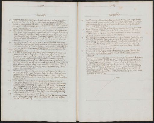 17: 18: 19: 6: 10: 29: 25: 22: 28: 24: 25: A 1687 December monsr. Vennekool bij mijn s mid: met mijn vrou, Sophia Josef, en Jan Elias by suster voet te gast nevens Willem Van der Molen. Elias Coym en vrou, scheyden ten 1ouren s achtermid opt oH met Temming too synent neu Appelman een Op t SH en in de boeren adviserende over 4 hange basten By Reael eens vervarst van daer met conf. Korvereens vervarst by neef Schaep samen met den hr van Vlooswyck in de nieuwek te begraffenis van daer met Bors en Hudde by Leseutre een gl ten 8 urenna huys synde mons. Marcelis byj myn op t S: H s achtermid: door mons. chappelier opt oH gel: van daer met Temming by Appel in s conp sleetie: een p sondt van der Stel een Rol Tac tot een present van te 17: wordt Geertie Barthelemeus turfvulster S ochtens met myn justitie rock in myn slee nae sH werdende 4 diven gehangen: met de vry na H sachtern in den R. Van daer met Bors en Hudde in t Heerlogem daer nevens schepenende wyn proefde voorschepens mael, nevns den officier ten 1ouren met myn sleena H Den hr van schagen by myn s achtermid in de Noordk s avons besocht van neef Devry Hooft: en hare vrouwen monsr Pluymer, en selcker samen een glaes etende savons myne kinderen by ons christranus Uytenbogaerg den Ad: Hurnius Etc by myn met myn slee naet of van daer nevens den hr van Polsbroeck int Herelogement Daer de oost conp de magistraet tracteerde ten 11 uren met myn soon Josef en Boreel na H Den afslager Van der Put by myn met hem naet sH van daer te gast by myn soon Reael nevens myn vrou Sophia Jan Coymans, Srschot, en Adriana f. Wesierhof Vickkevoort: Elias, Josef Coymans, en hare vrouwen brachten ten 11 uren sr Horiana met de caros thuys Capit Van Outsthoorn en syn vader, en Uyten bogaeve by myn met hem eent naet S:H Den professor Francius Etc by myn besocht van myn soon en dochter Huydecoper s ochtens in de Wester, en sachter mid in de Noordk 26: 24: 28: 24 30: 3: A 1687 December Sochtens in de Westk: van daer op t SH Doende Opmeer Et Rappere wegens het gepasseerde in de verg van haer Edgr met myn beminde in een sle op schepens mael int herelog ten 1/22 met een sletie na h Neef Aboo, en mons. Bidloo by myn met hem nae t SH met hudde naa H savons in de Westk in de voor bereyding S ochten sin de Westk: communicerende savons weder aldaer Etende myne kinderen by ons Den afslager Van der Put en Van der Kogen by myn met hem naa OH: met van Beuningen af, en naa de B s achtermid op t S:H met Opmeer af en met hem de Graef tromp en syn vrou besocht daer de maror Boreel. Reael en onse vrou wen en Sophia wede waren Gong myn beminde nevens hare 2 dochters in de caros, en ick te voet naa H S ochtens opt sx met myn beminde met een slee int Here logement op schepens mael met dito sletie ten 2 uiren weerom Domine van Lewen bij mijn die mijn sijne predicatien ad Romanos en 2 volumin in4 vereerde met myn bemindetegas by nicht van Hofdyck nevens nicht Duyts Pisoen haer dochter Tromp: neef Hoeft en Devroede, en hare vrouwen mede waren. op het Schouburg daer se voor de heeren speele van daer in t Heerelogement op schepens mael daer myn beminde door Devroede wierdt geleijdt ten 1 uren met onse slee na H