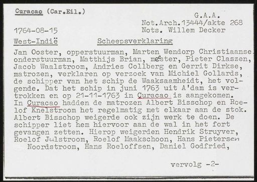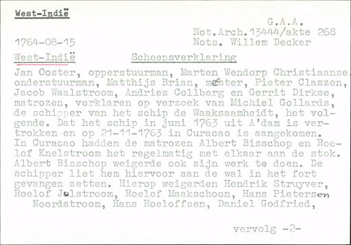 West-Indië Scheepsverklaring + Jan Ooster, opperstuurman, Marten Wendorp Christiaanse onderstuurman, Matthijs