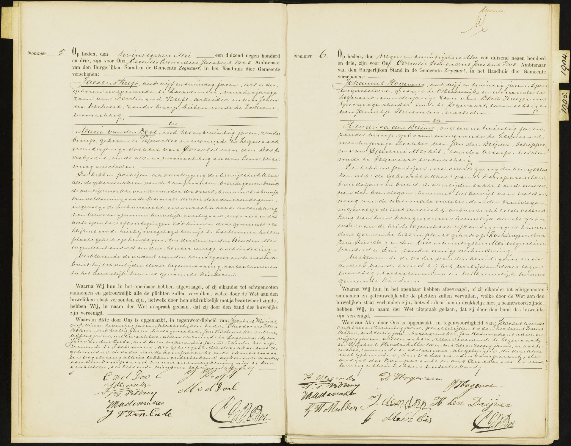BruidegomJohannes Hogeveen, geboren te Bleiswijk, 25 jaar oud, wonende te Zegwaart, spoorwegarbeider van beroep BruidHendrica den Drijver, geboren te Zegwaart, 21 jaar oud, wonende te Zegwaart |