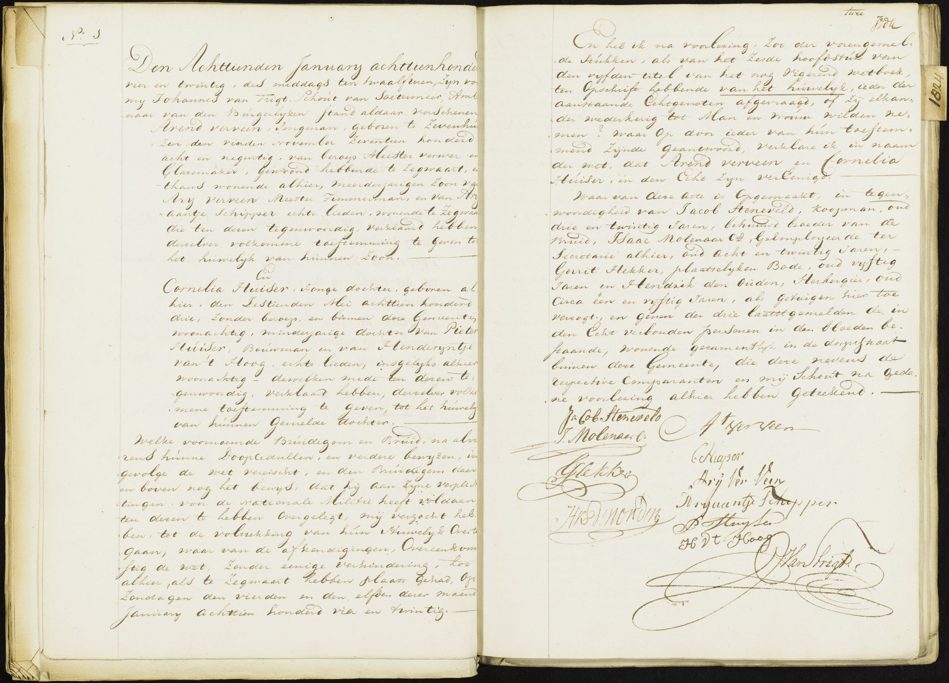 BruidegomArend Verveen, geboren op 4 november 1798 te Zevenhuizen, 25 jaar oud, wonende te Zoetermeer, mr verwer en glazenmaker van beroep BruidCornelia Huiser, geboren op 16 mei 1803 te Zoetermeer, 22 jaar oud, wonende te Zoetermeer |